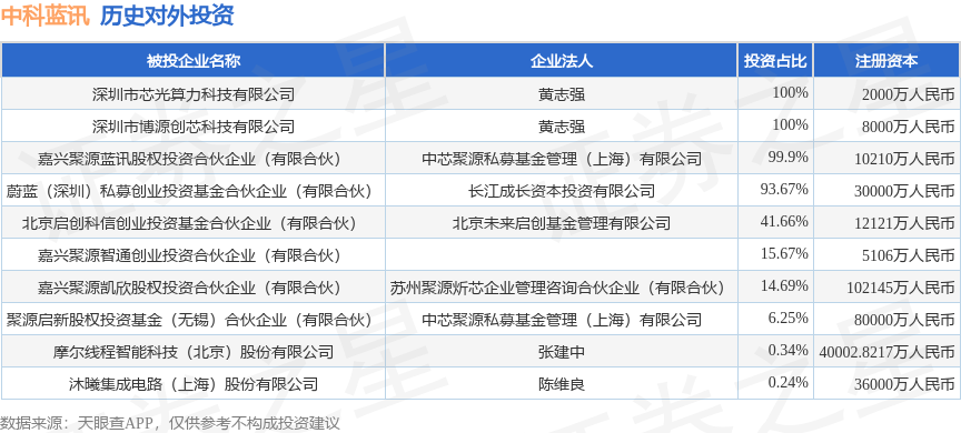 证券之星消息,根据天眼查APP显示,中科蓝讯(688332.SH)新增一起对外投资事件,被投资公司为嘉兴聚源智通创业投资合伙企业(有限合伙),法定代表人,投资占比为15.67%。该公司从事资本市场服务,注册资本为5106万人民币。目前,中科蓝讯共存在对外投资10项,详见下表: