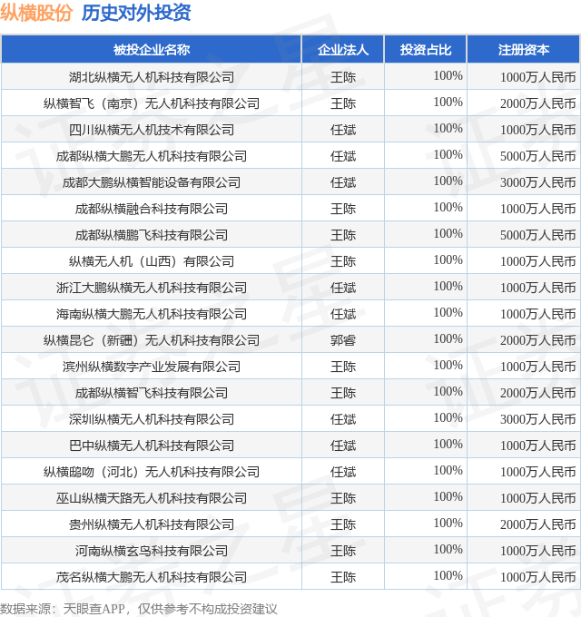 证券之星消息,根据天眼查APP显示,纵横股份(688070.SH)新增一起对外投资事件,被投资公司为湖北纵横无人机科技有限公司,法定代表人王陈,投资占比为100%。该公司从事计算机、通信和其他电子设备制造业,注册资本为1000万人民币。目前,纵横股份共存在对外投资39项,投资占比前20的项目见下表: