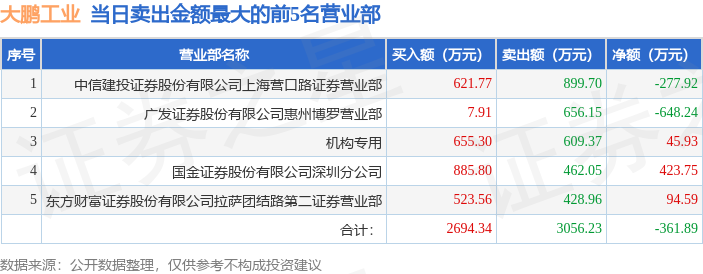 证券之星消息,沪深交易所2026年1月12日公布的交易公开信息显示,大鹏工业(920091)因当日换手率达到20%的前5只股票登上龙虎榜。此次是近5个交易日内第5次上榜。