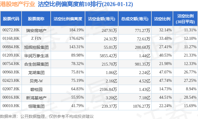 从沽空比例偏离度来看,瑞安房地产、Z FIN、旭辉控股集团沽空比例偏离度位居行业前三,分别为184.19%、176.62%、143.31%。