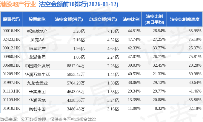 从沽空金额来看,新鸿基地产、贝壳-W、恒基地产沽空金额位居行业前三,分别为3.2亿港元、2.16亿港元、1.96亿港元。