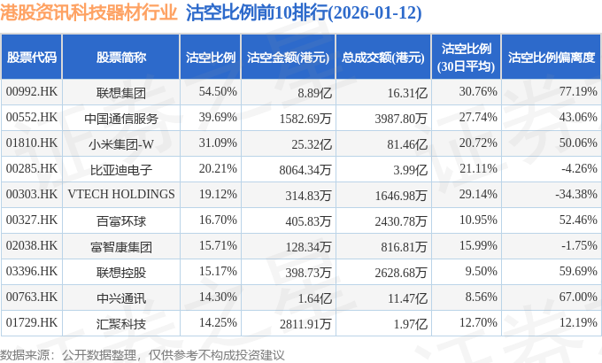 从沽空比例偏离度来看,联想集团、中兴通讯、联想控股沽空比例偏离度位居行业前三,分别为77.19%、67%、59.69%。