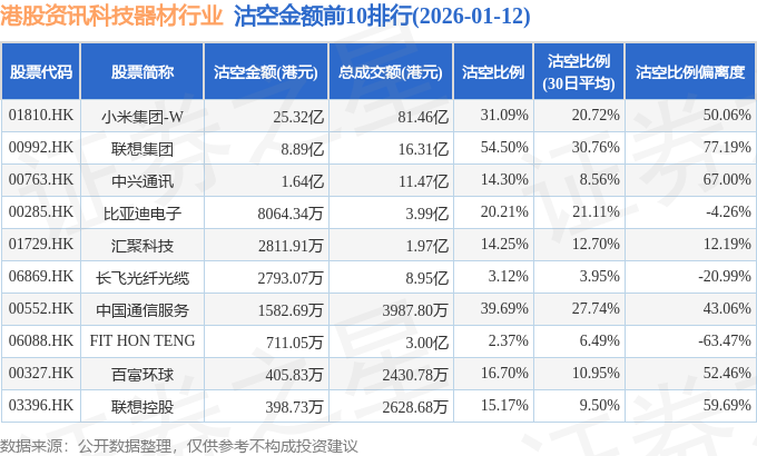 从沽空金额来看,小米集团-W、联想集团、中兴通讯沽空金额位居行业前三,分别为25.32亿港元、8.89亿港元、1.64亿港元。