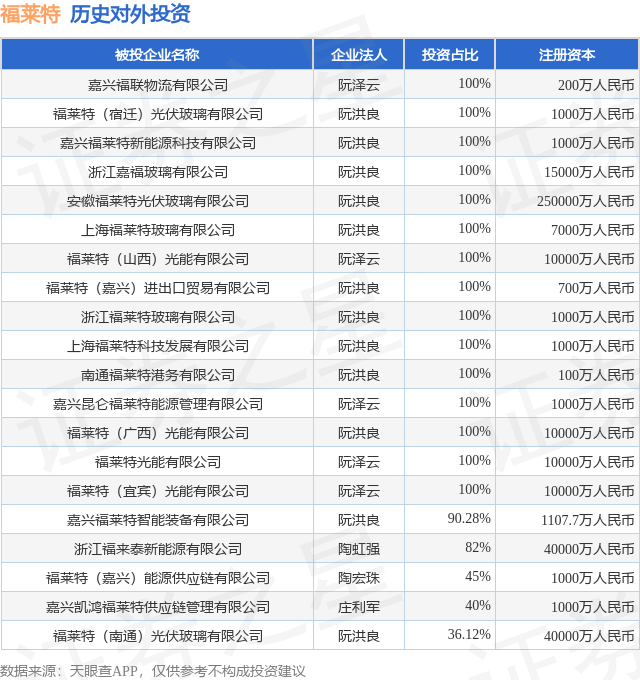 通过天眼查大数据分析,福莱特玻璃集团股份有限公司共对外投资了24家企业,参与招投标项目63次;财产线索方面有商标信息77条,专利信息192条,著作权信息3条;此外企业还拥有行政许可62个。据2024年报数据,福莱特长期股权投资1.12亿元,同比增11.45%。
