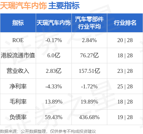 天瑞汽车内饰港股市值6亿港元,在汽车零部件行业中排名第18。主要指标见下表: