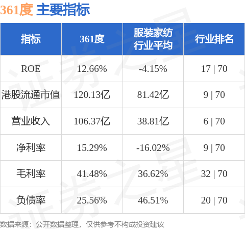 361度港股市值120.13亿港元,在服装家纺行业中排名第9。主要指标见下表: