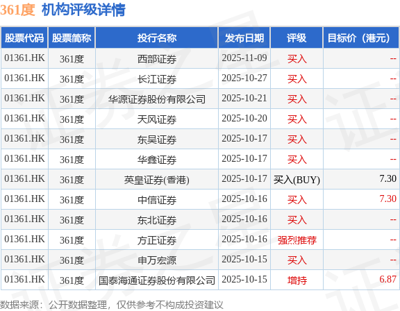 投行对该股的评级以买入为主,近90天内共有9家投行给出买入评级,近90天的目标均价为7.16港元。西部证券最新一份研报给予361度买入评级。