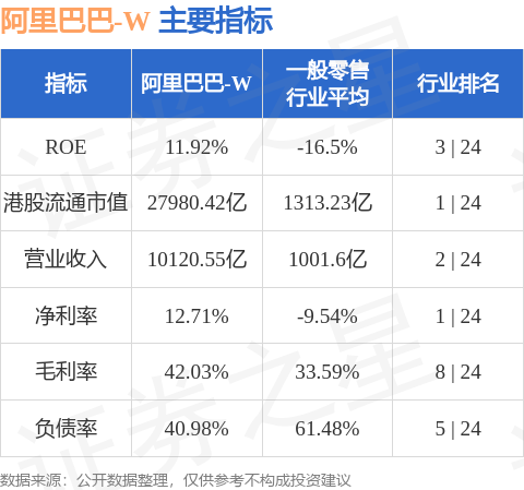 阿里巴巴-W港股市值27980.4亿港元,在一般零售行业中排名第1。主要指标见下表: