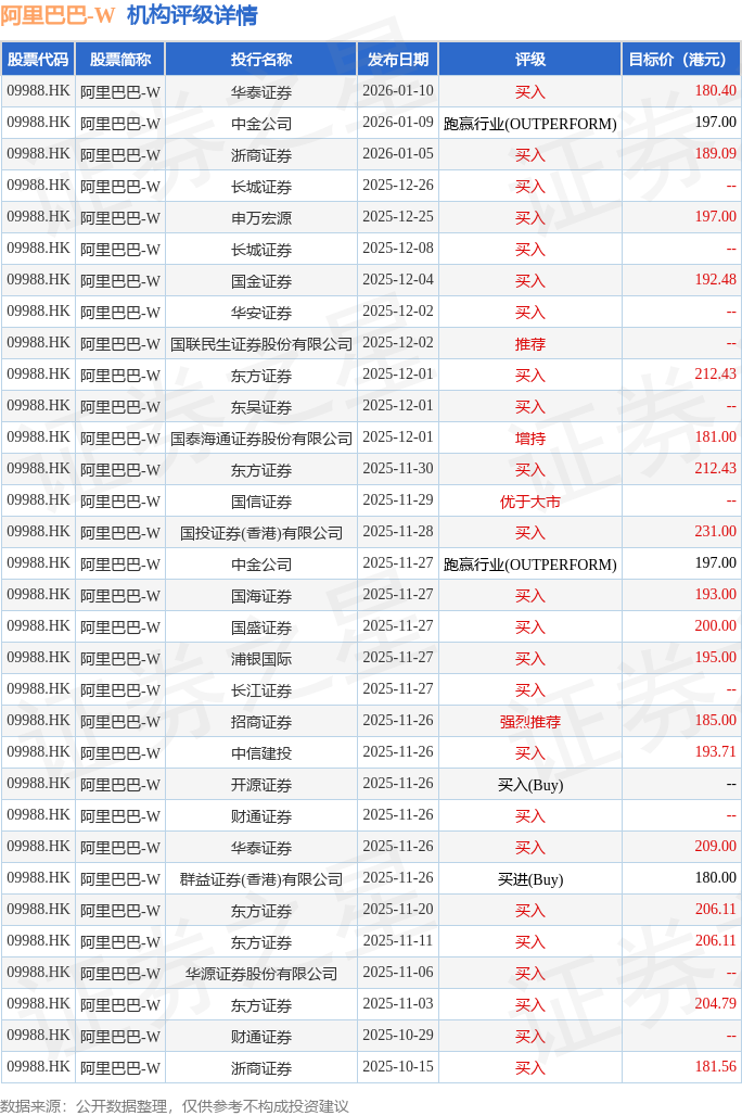 投行对该股的评级以买入为主,近90天内共有24家投行给出买入评级,近90天的目标均价为197.34港元。华泰证券最新一份研报给予阿里巴巴-W买入评级,目标价180.4港元。
