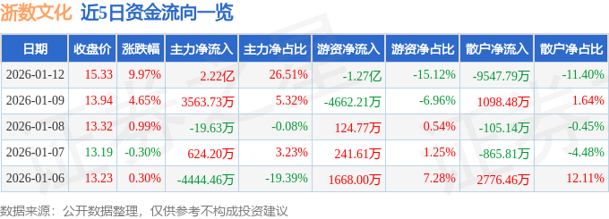 1月12日的资金流向数据方面,主力资金净流入2.22亿元,占总成交额26.51%,游资资金净流出1.27亿元,占总成交额15.12%,散户资金净流出9547.79万元,占总成交额11.4%。