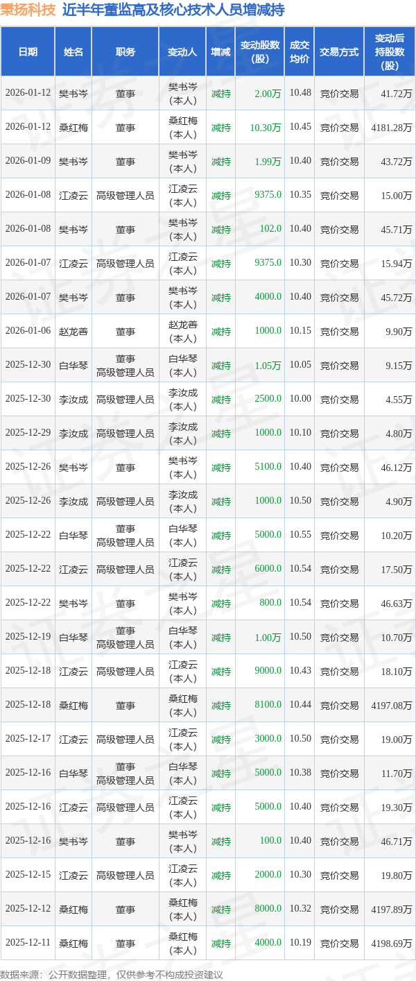秉扬科技近半年内的董监高及核心技术人员增减持详情如下: