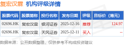 投行对该股的评级以推荐为主,近90天内共有1家投行给出推荐评级,近90天的目标均价为124.97港元。银河证券最新一份研报给予复宏汉霖推荐评级,目标价124.97港元。