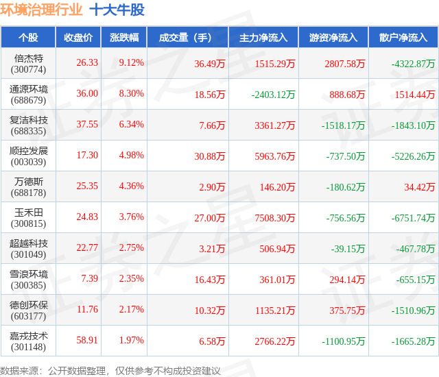 个股表现方面,环境治理行业当日领涨股为倍杰特(300774),该股当日报收26.33,上涨9.12%,成交量36.49万,主力资金净流入1515.29万元。通源环境(688679)以上涨8.3%紧随其后,该股当日成交量18.56万,主力资金净流出2403.12万元。除此之外,复洁科技(688335)、顺控发展(003039)、万德斯(688178)均进入当日牛股之列。具体个股列表见下表: