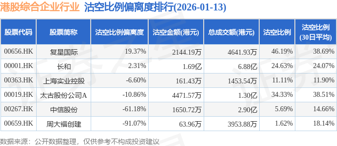 从沽空比例偏离度来看,复星国际、长和、上海实业控股沽空比例偏离度位居行业前三,分别为19.37%、2.31%、-6.6%。