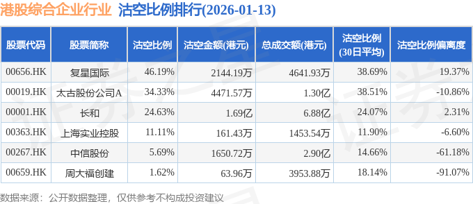 从沽空比例来看,复星国际、太古股份公司A、长和沽空比例位居行业前三,分别为46.19%、34.33%、24.63%。