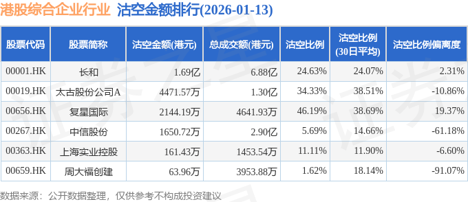 从沽空金额来看,长和、太古股份公司A、复星国际沽空金额位居行业前三,分别为1.69亿港元、4471.57万港元、2144.19万港元。