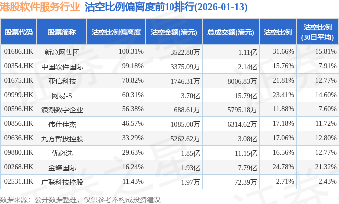 证券之星消息,1月13日港交所披露数据显示,当日港股软件服务行业的168只个股中有44只被沽空,总沽空股数为3.62亿股,总沽空金额为39.2亿元(港元),而当日软件服务行业的总成交金额为351.84亿元(港元),沽空比例为11.14%。当日软件服务行业总体涨0.32%。