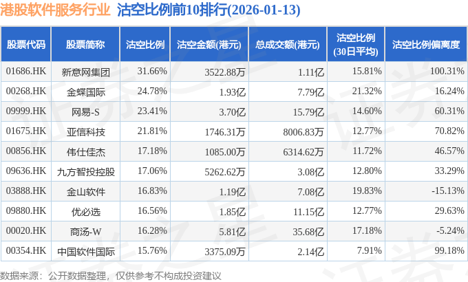从沽空比例来看,新意网集团、金蝶国际、网易-S沽空比例位居行业前三,分别为31.66%、24.78%、23.41%。