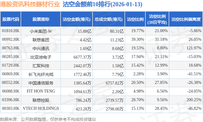 从沽空金额来看,小米集团-W、联想集团、中兴通讯沽空金额位居行业前三,分别为15.88亿港元、4.42亿港元、1.69亿港元。