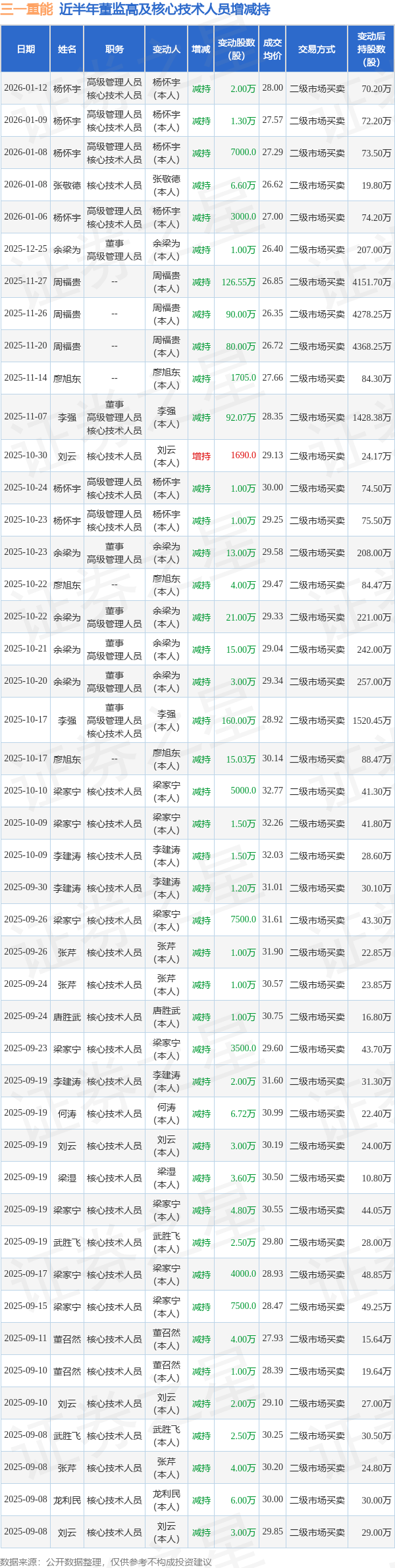 三一重能近半年内的董监高及核心技术人员增减持详情如下: