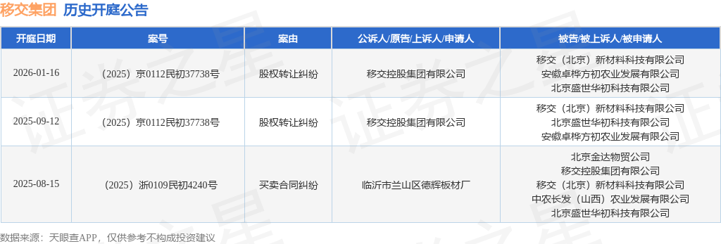 案号:(2025)京0112民初37738号根据统计,近一年内以移交控股集团有限公司为当事人的历史开庭公告有3则,其中案由为“股权转让纠纷”的公告以2则居首,其次为“买卖合同纠纷”有1则。历史开庭公告如下: