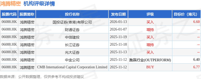 投行对该股的评级以买入为主,近90天内共有3家投行给出买入评级,近90天的目标均价为6.59港元。国投证券(香港)有限公司最新一份研报给予鸿腾精密买入评级,目标价6.6港元。