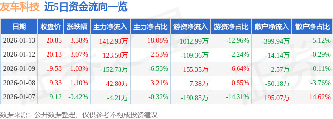 1月13日的资金流向数据方面,主力资金净流入1412.93万元,占总成交额18.08%,游资资金净流出1012.99万元,占总成交额12.96%,散户资金净流出399.94万元,占总成交额5.12%。