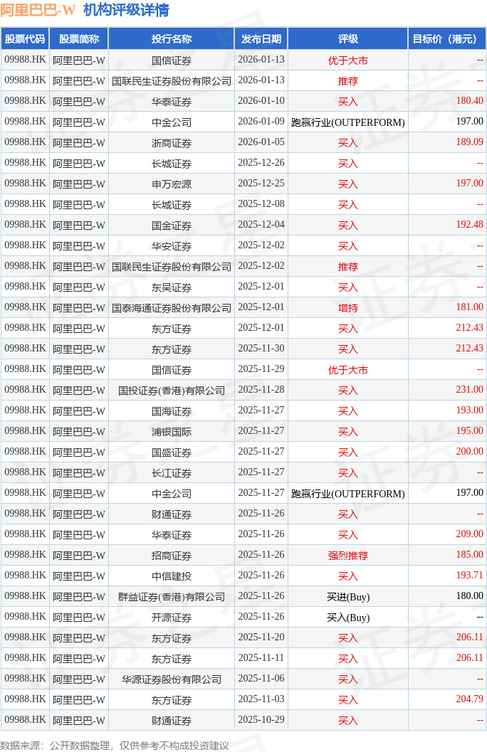 投行对该股的评级以买入为主,近90天内共有23家投行给出买入评级,近90天的目标均价为198.13港元。国信证券最新一份研报给予阿里巴巴-W优于大市评级。