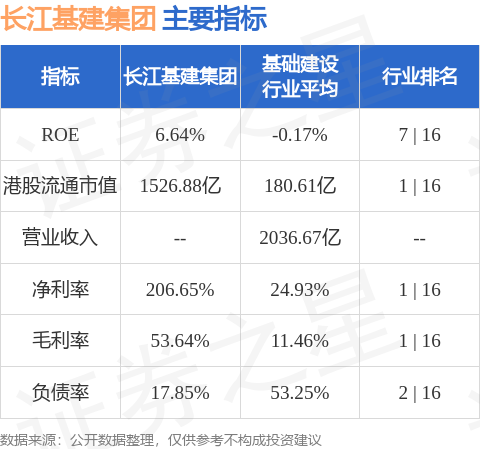长江基建集团港股市值1526.88亿港元,在基础建设行业中排名第1。主要指标见下表:
