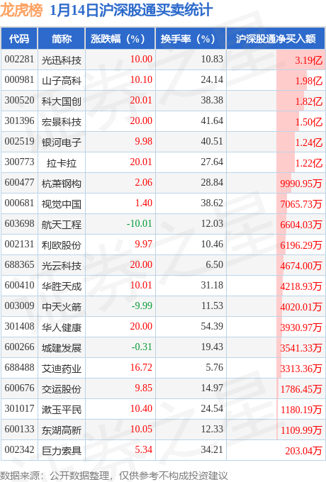 龙虎榜中有沪股通/深股通专用席位(北向资金)现身的个股共34家,其中光迅科技以净买入3.19亿元排名第一。详情见下表: