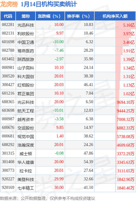 当日公布的交易所龙虎榜中有机构专用席位现身的个股共43家,其中光迅科技以净买入5.16亿元排名第一。详情见下表: