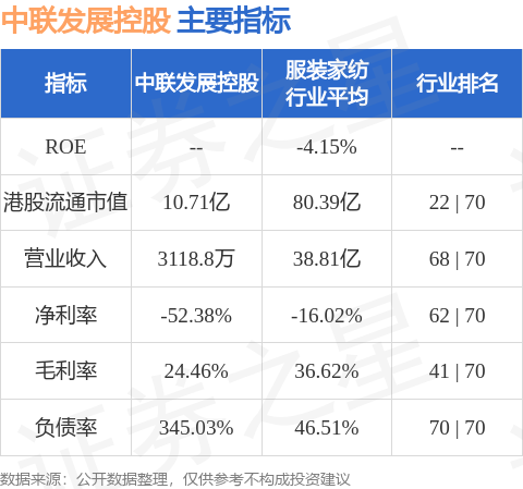 中联发展控股港股市值10.71亿港元,在服装家纺行业中排名第22。主要指标见下表: