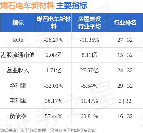 烯石电车新材料港股市值2.08亿港元,在房屋建设行业中排名第15。主要指标见下表: