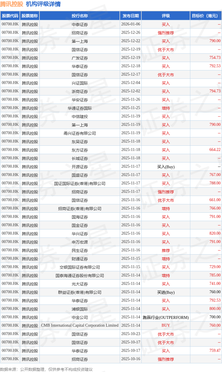 截至2026年1月14日收盘,腾讯控股(00700.HK)报收于633.0港元,上涨0.88%,成交量2867.73万股,成交额181.46亿港元。投行对该股的评级以买入为主,近90天内共有24家投行给出买入评级,近90天的目标均价为763.51港元。中泰证券最新一份研报给予腾讯控股买入评级。