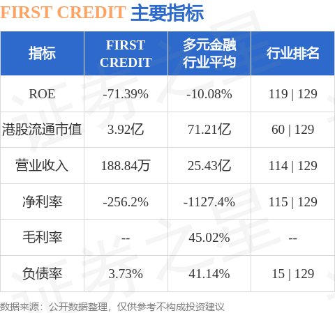 FIRST CREDIT港股市值3.92亿港元,在多元金融行业中排名第60。主要指标见下表: