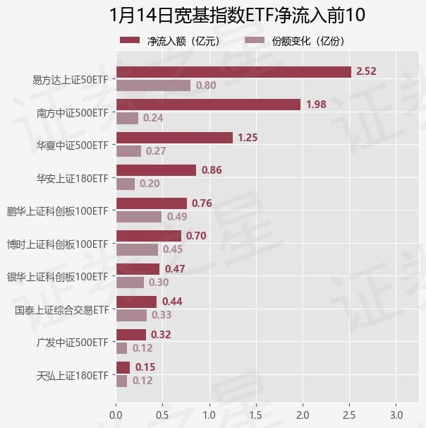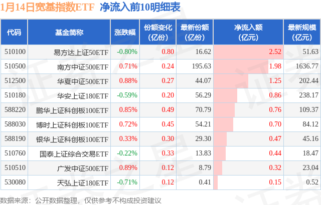 当日有32只宽基指数ETF基金出现资金净流入,其中净流入排首位的是易方达上证50ETF(510100),份额增加了8010.0万份,净流入额为2.52亿元。