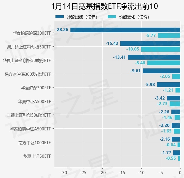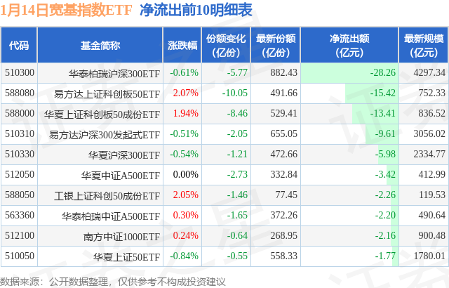 当日有79只宽基指数ETF基金出现资金净流出,其中净流出排首位的是华泰柏瑞沪深300ETF(510300),份额减少了5.77亿份,净流出额为28.26亿元。