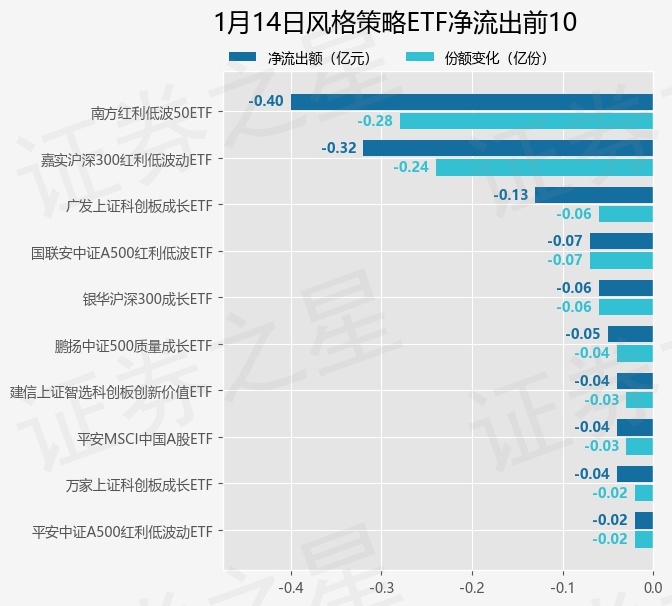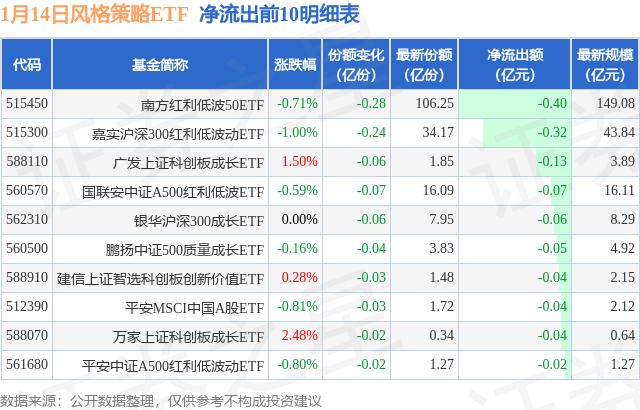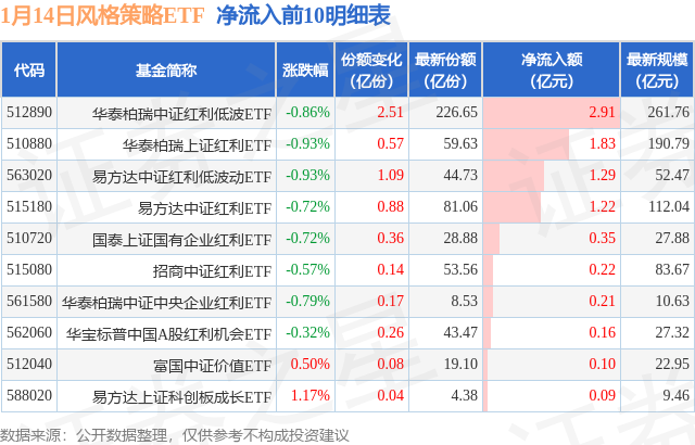 当日有14只风格策略ETF基金出现资金净流入,其中净流入排首位的是华泰柏瑞中证红利低波ETF(512890),份额增加了2.51亿份,净流入额为2.91亿元。
