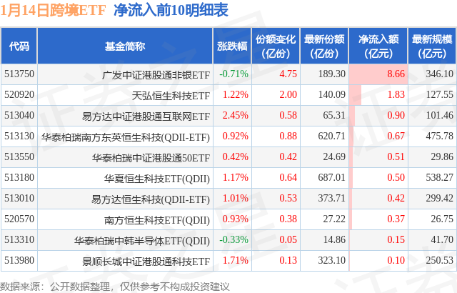 当日有28只跨境ETF基金出现资金净流入,其中净流入排首位的是广发中证港股通非银ETF(513750),份额增加了4.75亿份,净流入额为8.66亿元。