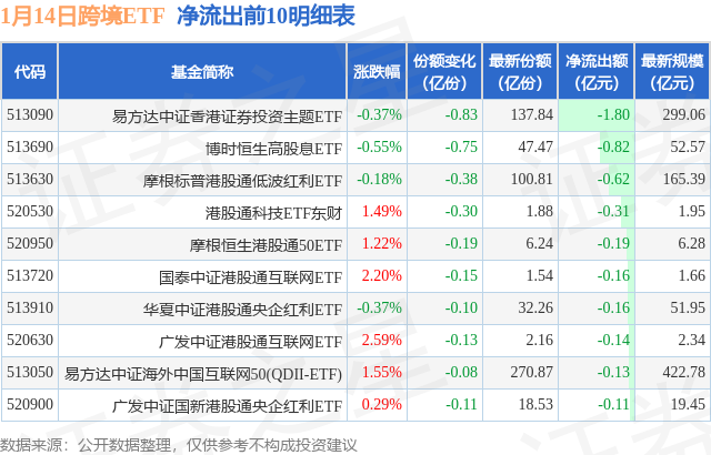 当日有30只跨境ETF基金出现资金净流出,其中净流出排首位的是易方达中证香港证券投资主题ETF(513090),份额减少了8300.0万份,净流出额为1.8亿元。