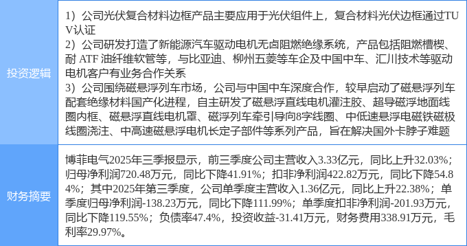 证券之星消息,博菲电气1月15日涨停收盘,收盘价50.19元。该股于9点32分涨停,2次打开涨停,截止收盘封单资金为2.92亿元,占其流通市值8.19%。