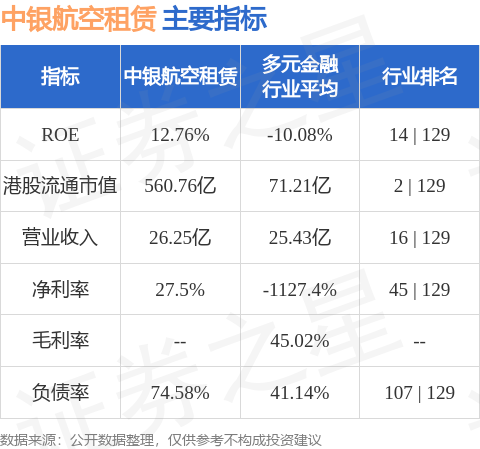 中银航空租赁港股市值560.76亿港元,在多元金融行业中排名第2。主要指标见下表: