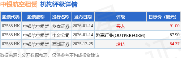 投行对该股的评级以跑赢行业(OUTPERFORM)为主,近90天内共有1家投行给出跑赢行业(OUTPERFORM)评级,近90天的目标均价为87.76港元。华泰证券最新一份研报给予中银航空租赁买入评级,目标价91港元。
