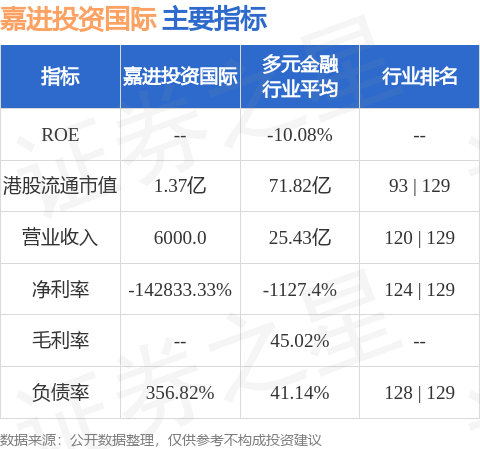 嘉进投资国际港股市值1.37亿港元,在多元金融行业中排名第93。主要指标见下表: