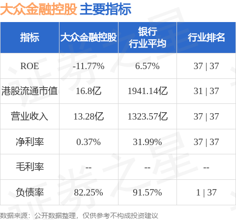 大众金融控股港股市值16.8亿港元,在银行行业中排名第31。主要指标见下表: