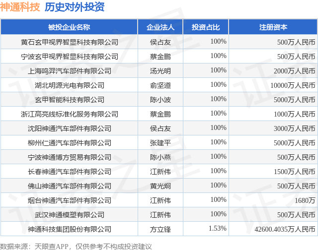 证券之星消息,根据天眼查APP显示,神通科技(605228.SH)新增一起对外投资事件,被投资公司为黄石玄甲视界智显科技有限公司,法定代表人侯占友,投资占比为100%。该公司从事计算机、通信和其他电子设备制造业,注册资本为500万人民币。目前,神通科技共存在对外投资14项,详见下表: