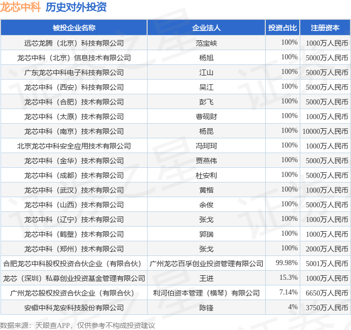 通过天眼查大数据分析,龙芯中科技术股份有限公司共对外投资了19家企业,参与招投标项目190次;财产线索方面有商标信息460条,专利信息1128条,著作权信息87条;此外企业还拥有行政许可6个。