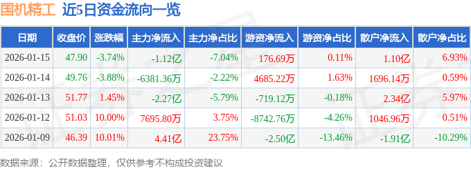证券之星消息,截至2026年1月15日收盘,国机精工(002046)报收于47.9元,下跌3.74%,换手率6.28%,成交量33.21万手,成交额15.93亿元。