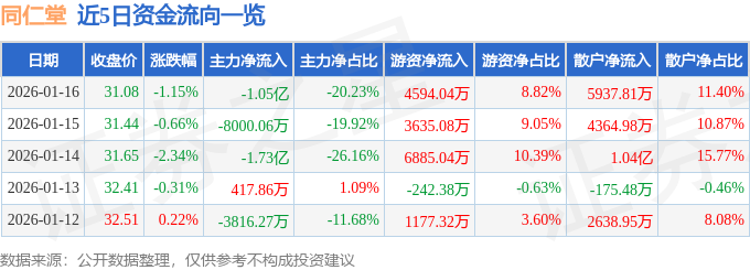 证券之星消息,截至2026年1月16日收盘,同仁堂(600085)报收于31.08元,下跌1.15%,换手率1.22%,成交量16.72万手,成交额5.21亿元。