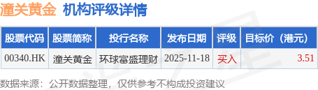 截至2026年1月16日收盘,潼关黄金(00340.HK)报收于3.36港元,下跌0.89%,成交量2703.46万股,成交额9023.67万港元。投行对该股的评级以买入为主,近90天内共有1家投行给出买入评级,近90天的目标均价为3.51港元。环球富盛理财最新一份研报给予潼关黄金买入评级,目标价3.51港元。